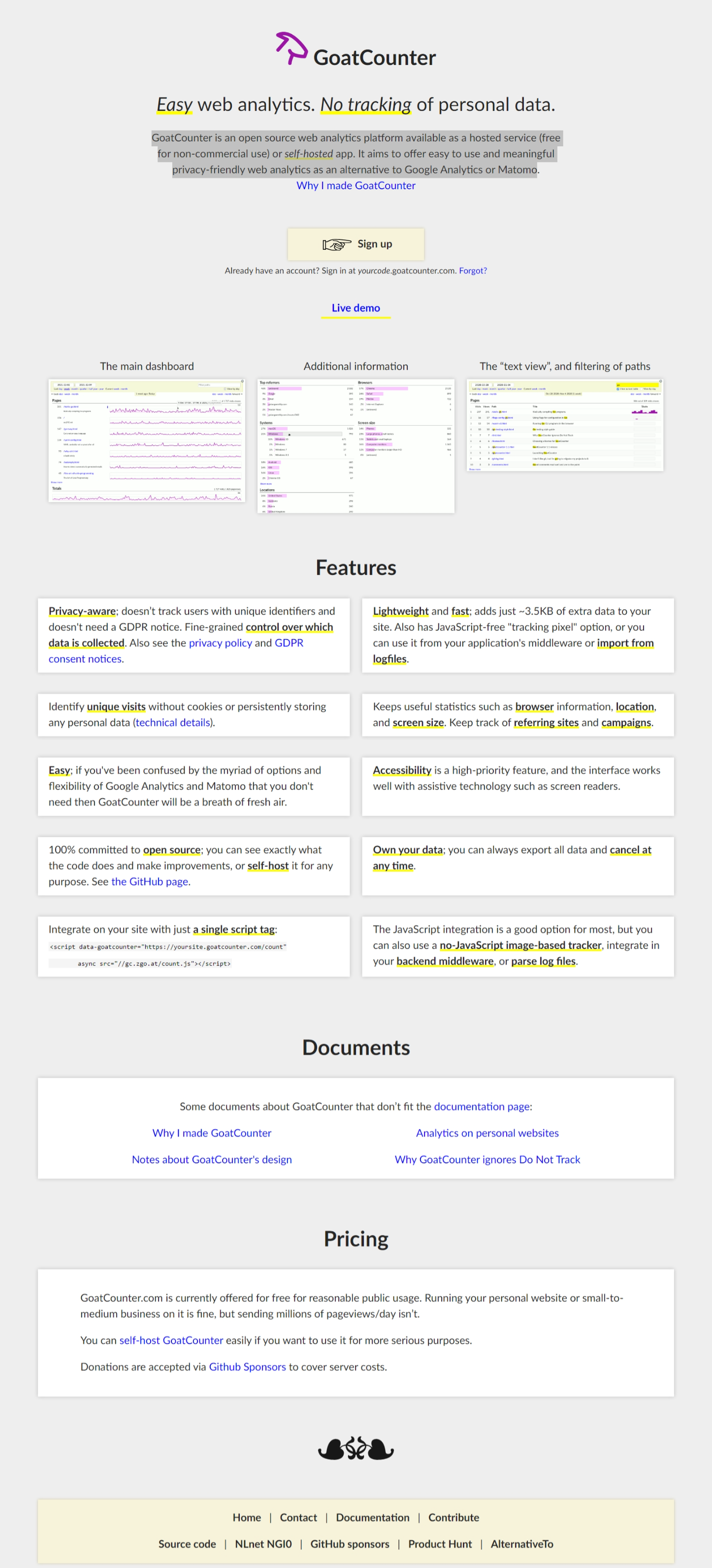 GoatCounter is an open source web analytics platform available as a hosted service (free for non-commercial use) or self-hosted app. It aims to offer easy to use and meaningful privacy-friendly web analytics as an alternative to Google Analytics or Matomo